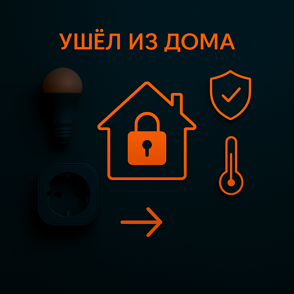Автоматическое отключение света, розеток, активация охраны и снижение температуры.