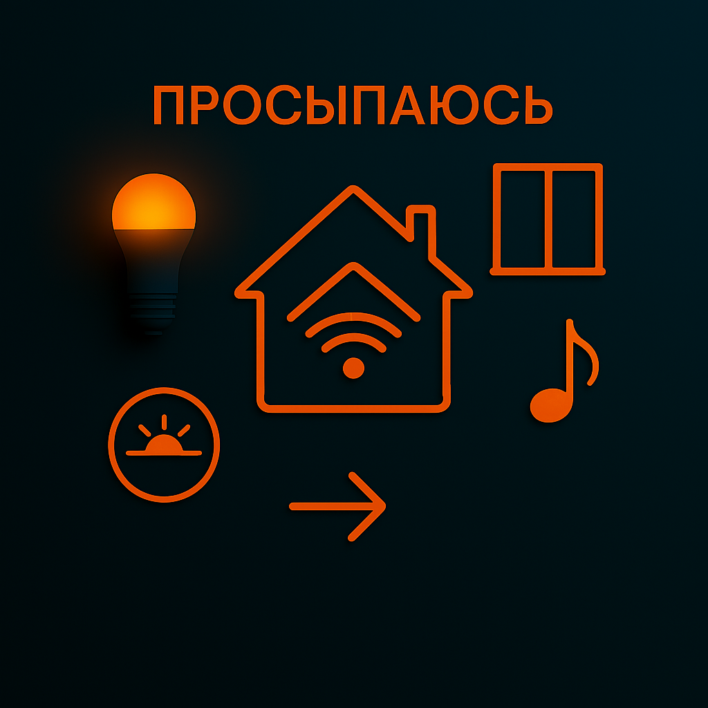 Плавное включение света, открытие штор, включение музыки или новостей. Комфортное пробуждение без стресса.